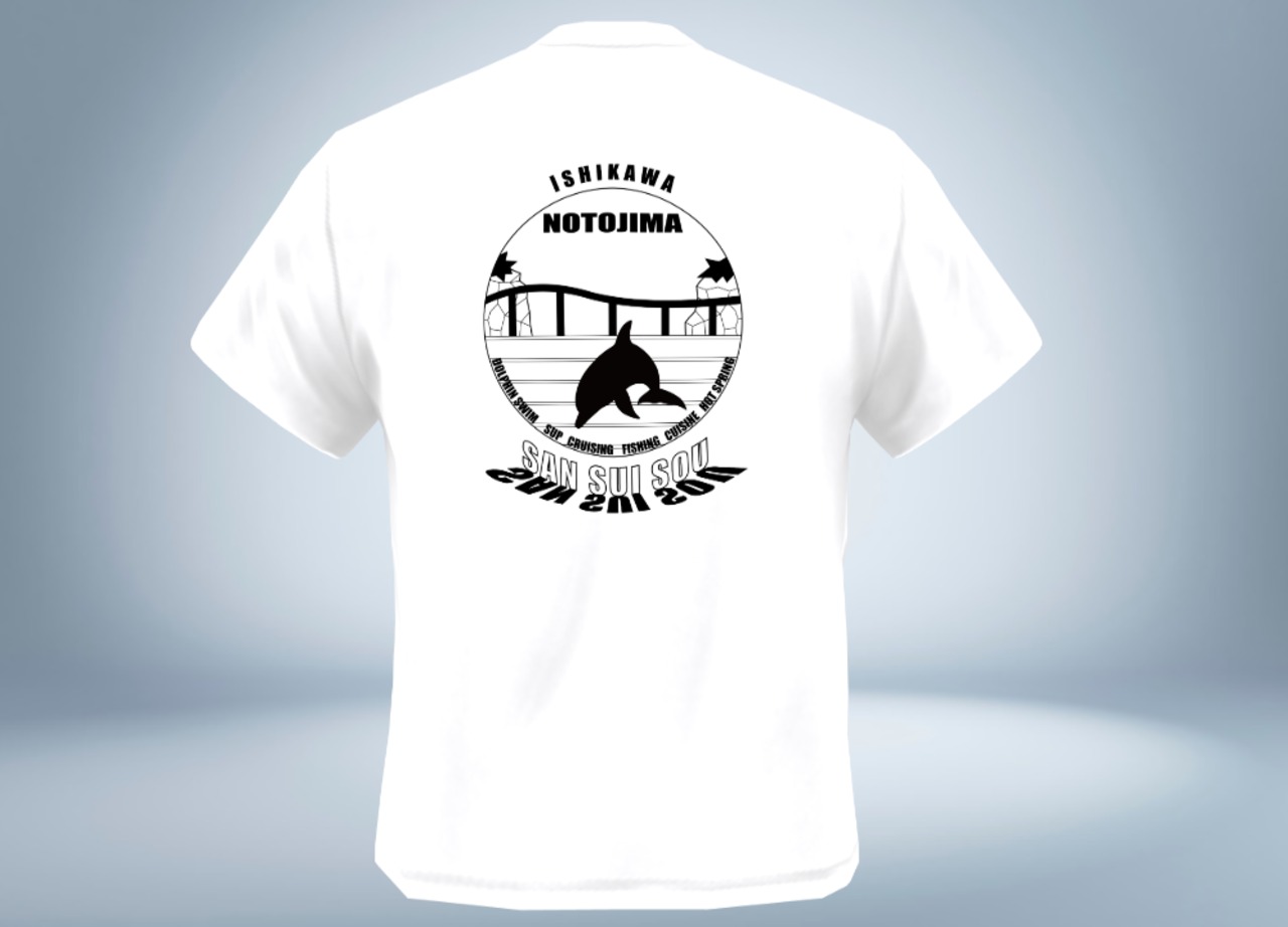 能登島の海に沈みゆく夕日とその中で元気に泳ぐイルカ。そして能登島大橋とのコラボレーションを表現したこのTシャツ。着るたびに能登島のことが大好きになってしまいそうです。