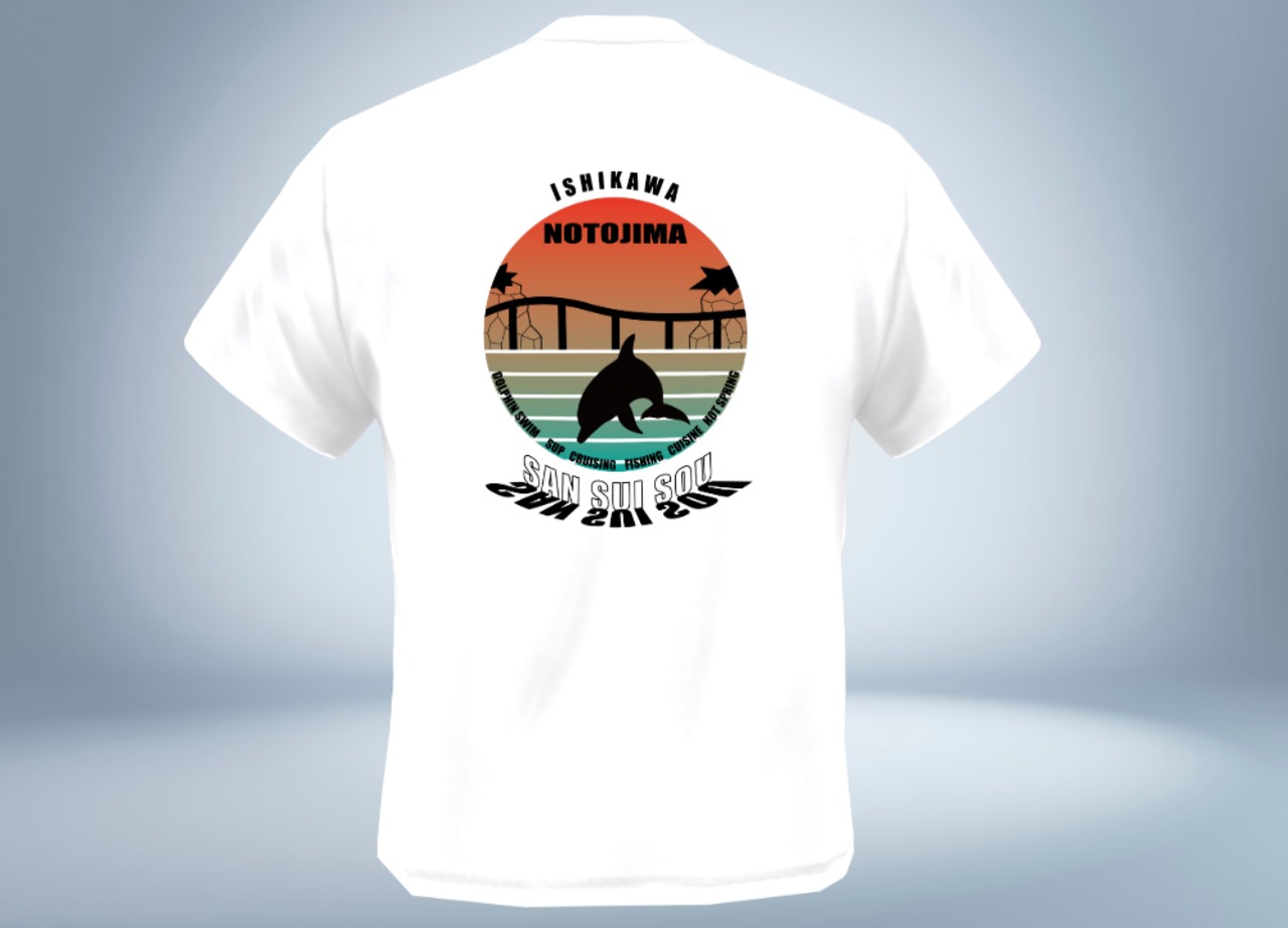 能登島の海に沈みゆく夕日とその中で元気に泳ぐイルカ。そして能登島大橋とのコラボレーションを表現したこのTシャツ。着るたびに能登島のことが大好きになってしまいそうです。