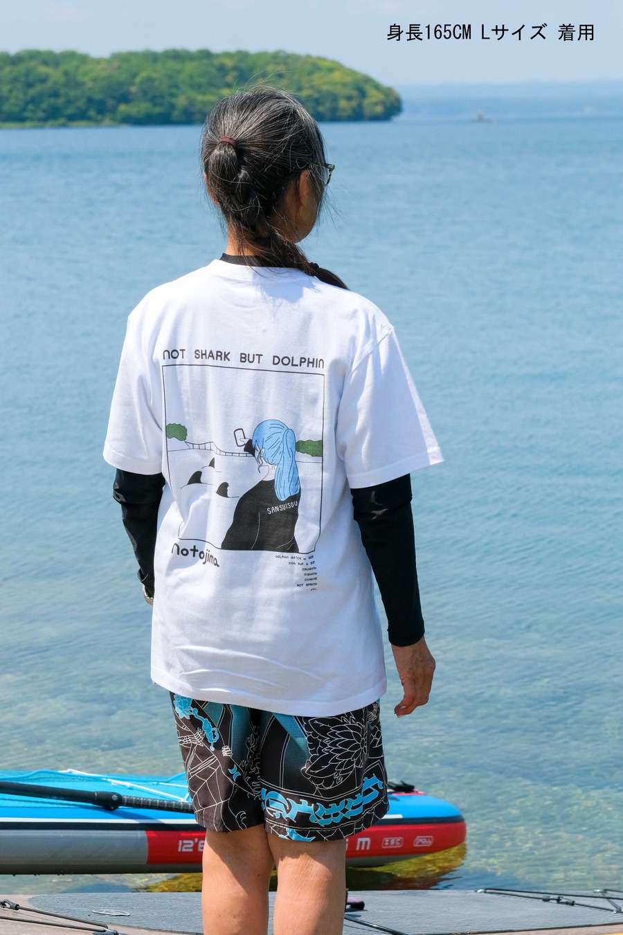イルカと一緒に泳ぐアクティビティ、イルカスイムでは能登島の海に生息する野生のイルカたちと一緒に泳ぐことができます。そんなイルカスイムで出会った生後間もない赤ちゃんイルカを写真に撮影し、その画像をもとにTシャツにデザインしました。